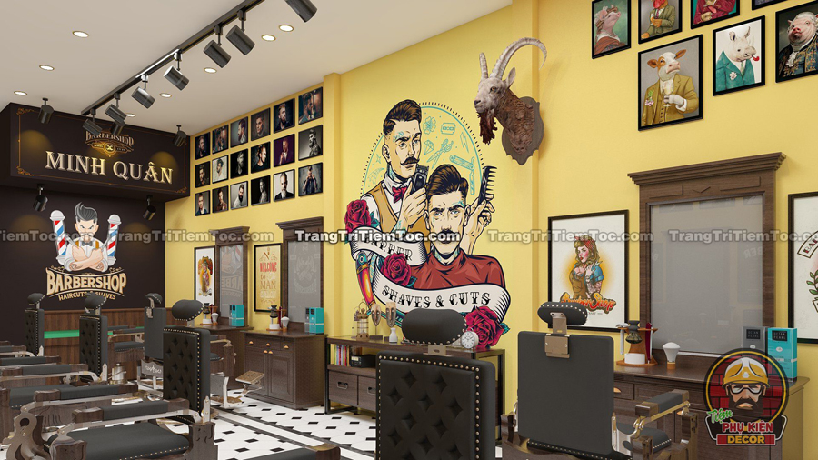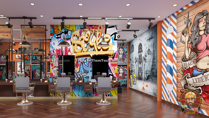 Tùy theo phong cách Cửa Tiệm Bạn đang theo đuổi để Bạn lựa chọn màu sơn tường cho Salon của Mình. Tone màu đậm, gam trầm phù hợp với các tiệm Barber phong cách Cổ điển, Metal, hay Chicano. Các Bức tường sẽ được sơn đơn sắc một Gam màu, sau đó decor trang trí bằng các món phụ kiện nhiều họa tiết như : Tranh, Ảnh, Decal, Đầu bò, Đèn …