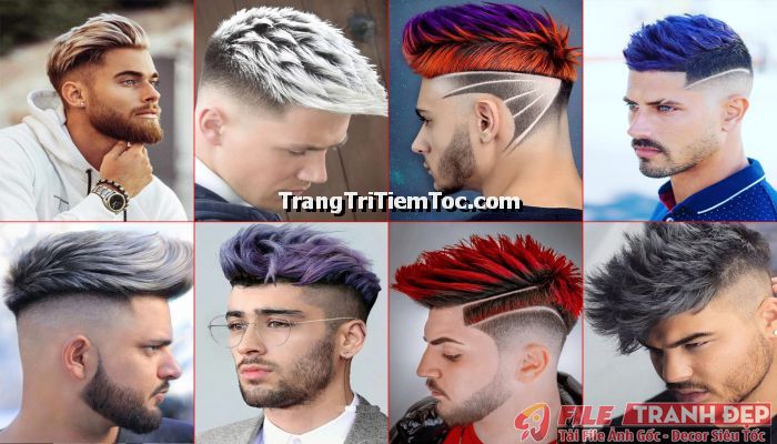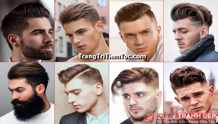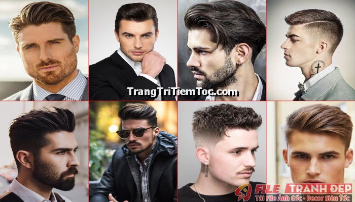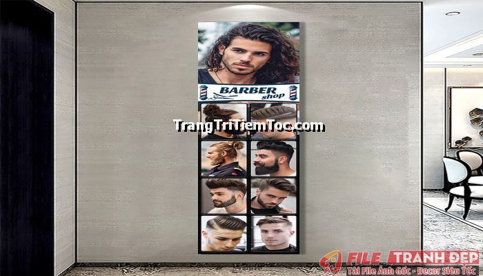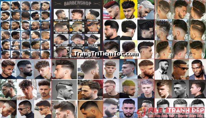 1. Tranh decal tổng hợp trang trí tiệm tóc nam, tiệm barber shop đa dạng các kiểu tạo mẫu tóc đẹp, thịnh hành, hợp thời trang, hiện đại góp phần thu hút khách hàng muốn được trải nghiệm