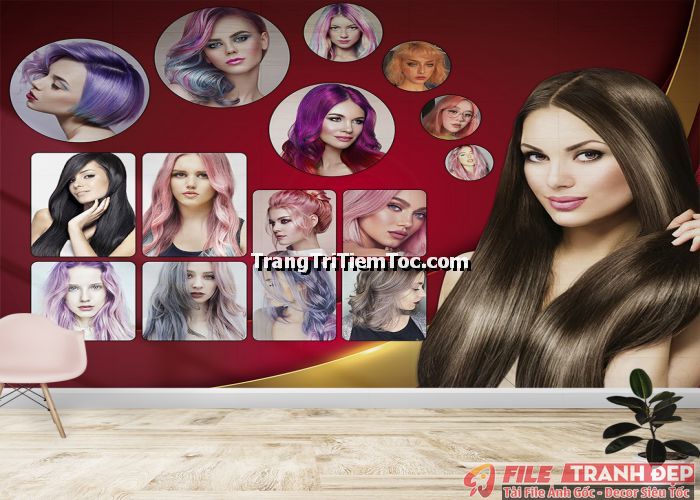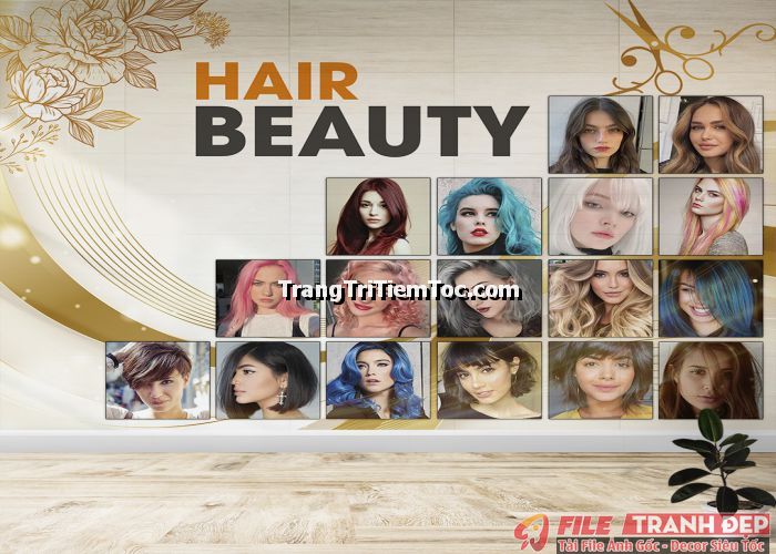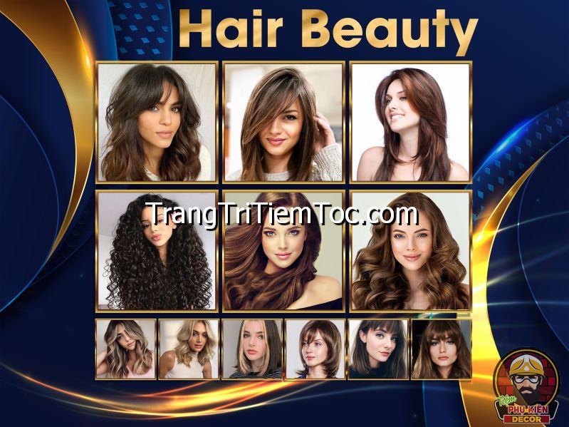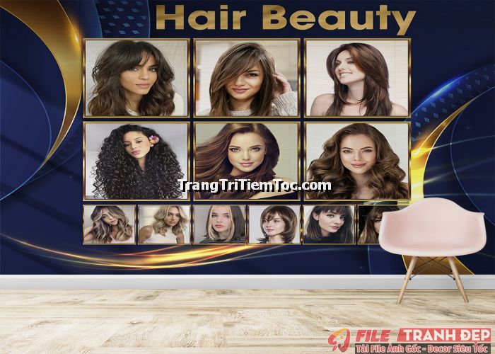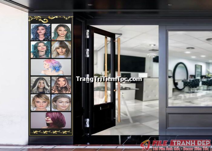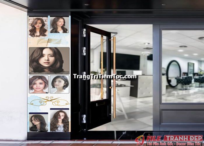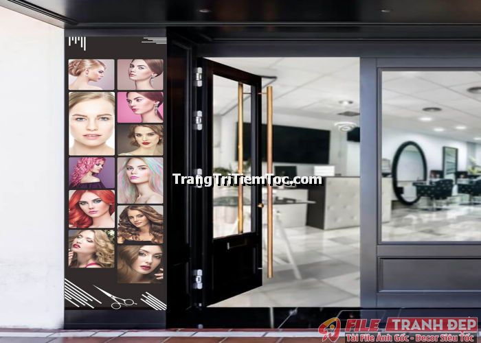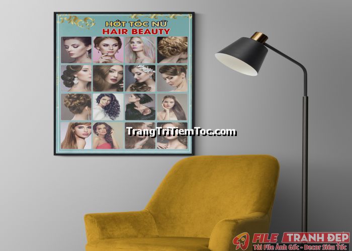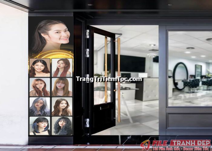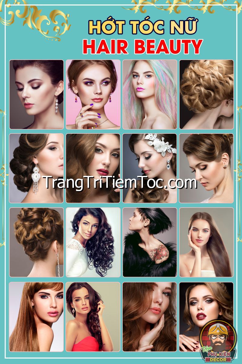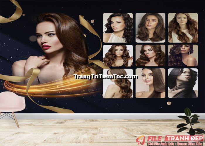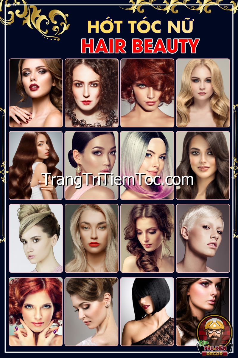 1. Tranh decal tổng hợp trang trí tiệm tóc nữ, salon tóc nữ đa dạng các kiểu tạo mẫu tóc đẹp, thịnh hành, hợp thời trang, hiện đại góp phần thu hút khách hàng muốn được trải nghiệm