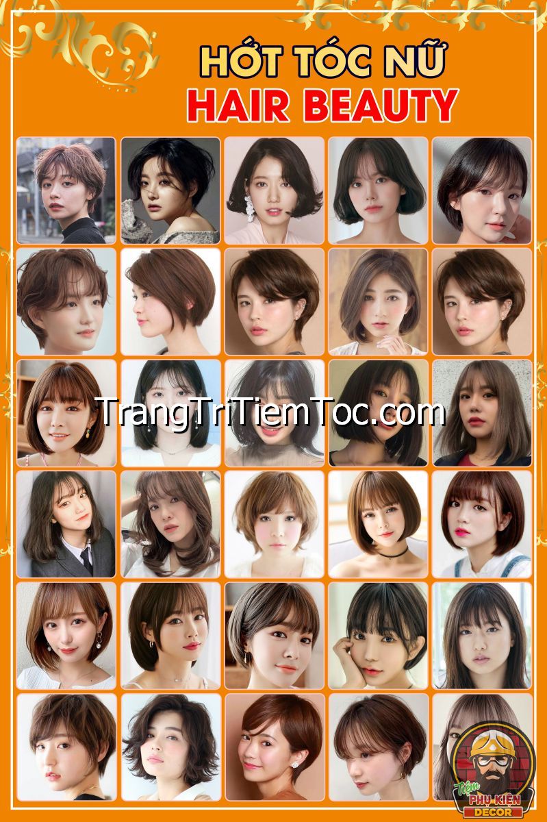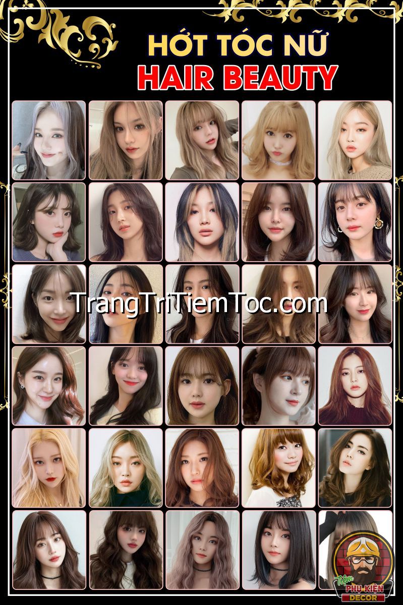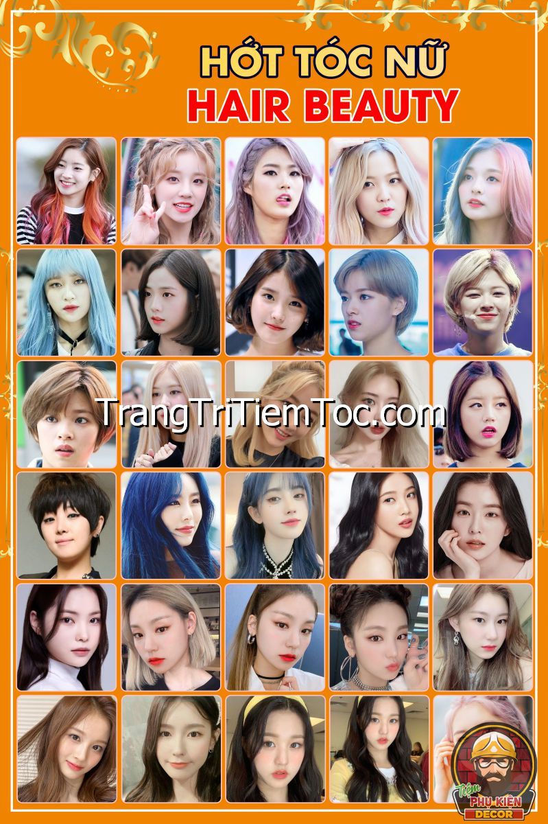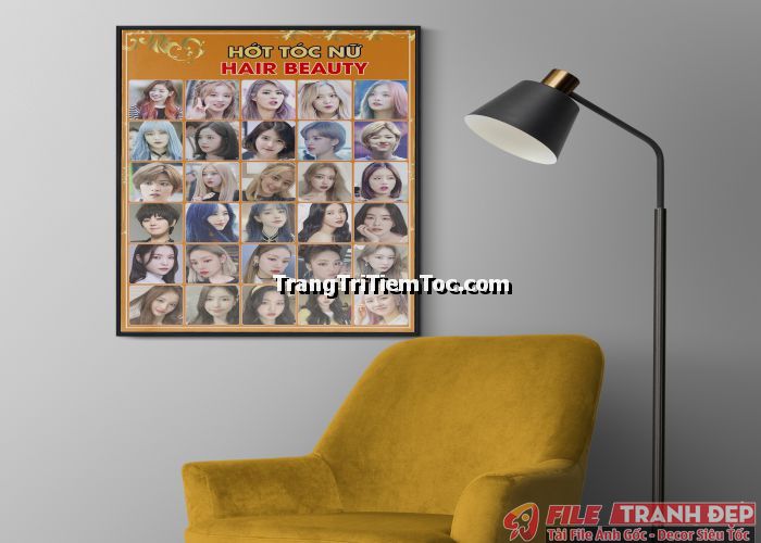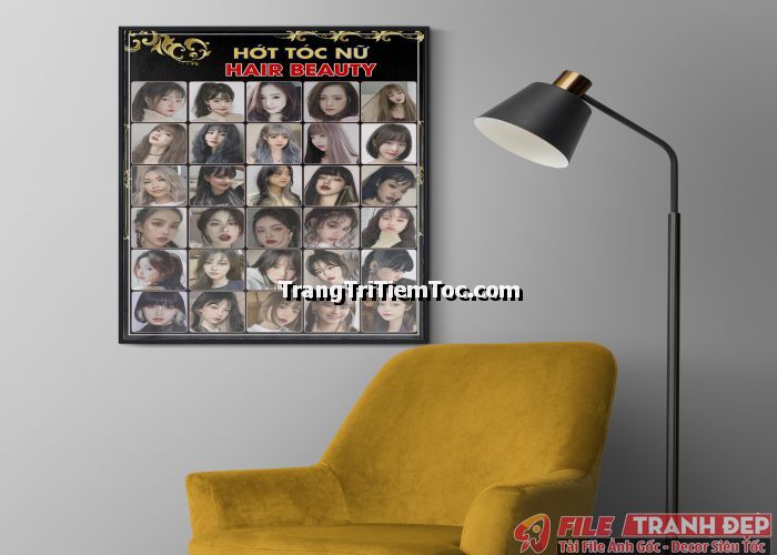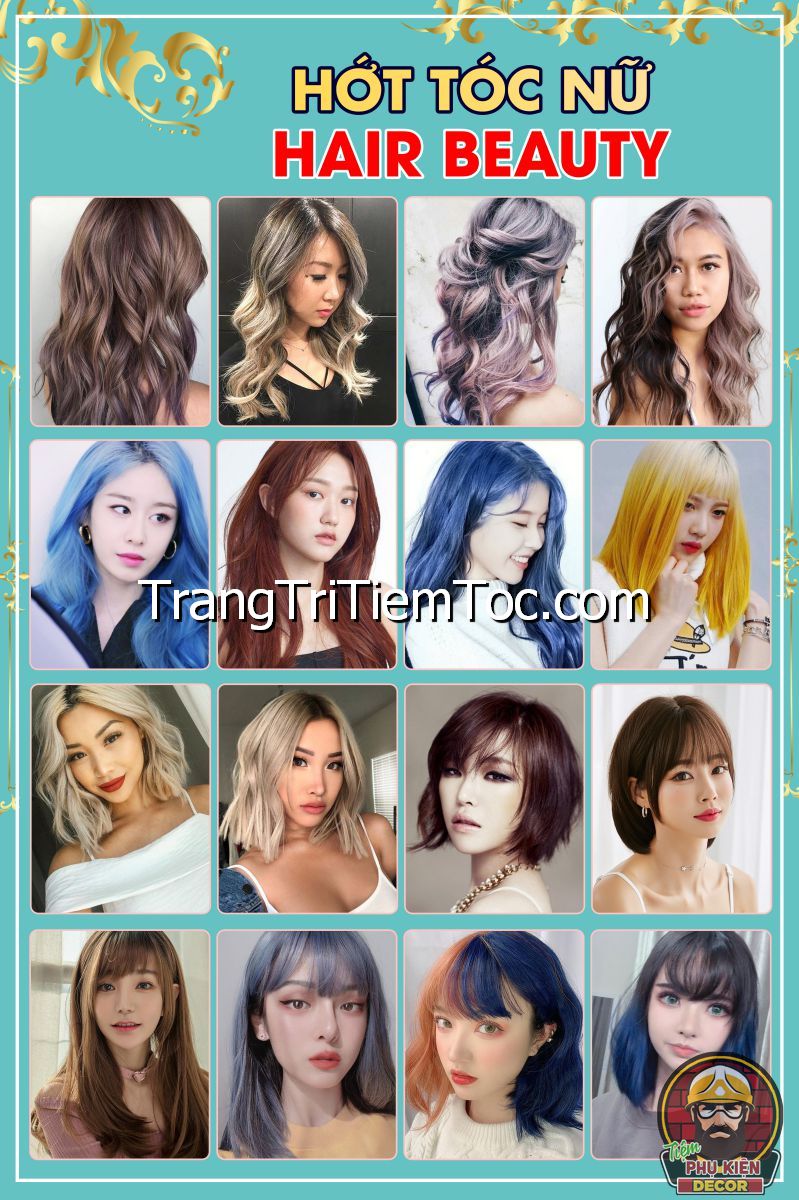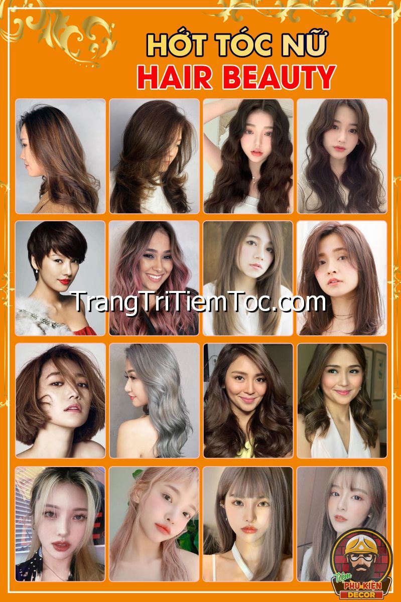 1. Tranh decal tổng hợp trang trí tiệm tóc nữ, salon tóc nữ đa dạng các kiểu tạo mẫu tóc đẹp, thịnh hành, hợp thời trang, hiện đại góp phần thu hút khách hàng muốn được trải nghiệm