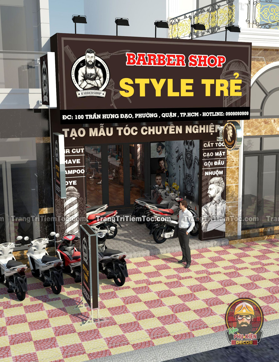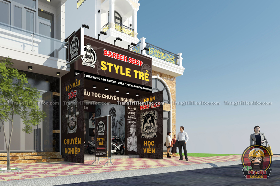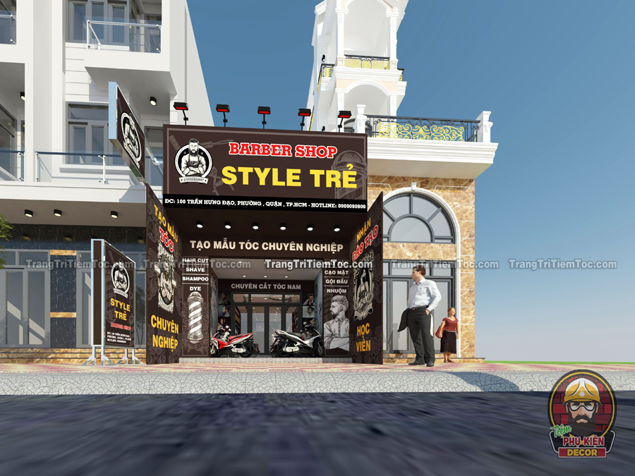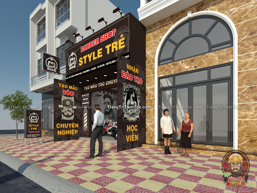 Mẫu thiết kế Tiệm Tóc Nam dành riêng cho các Bạn yêu thích phong cách Barber Shop kiểu Châu Âu, với màu sắc mạnh mẽ, nam tính. Toàn bộ không gian tạo nên sự đồng nhất và chuyên nghiệp. Dưới đây là toàn bộ phối cảnh tổng thể nội và ngoại thất của mẫu Tiệm Tóc Nam nhỏ xinh, hy vọng sẽ là tư liệu tham khảo quan trọng, giúp Bạn tự tay decor cho cửa Tiệm của mình thật ấn tượng nhé !