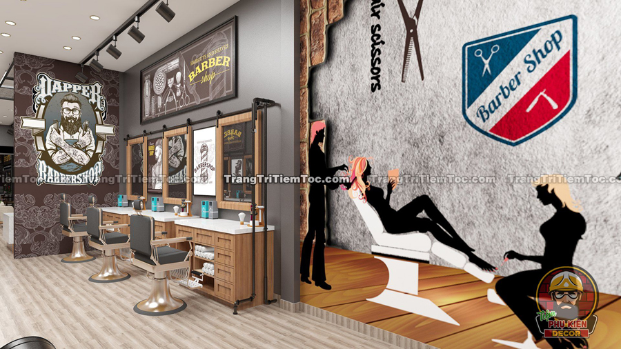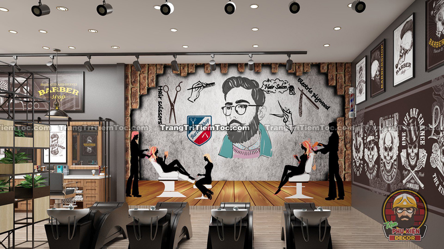 Để tăng tính nhận diện thương hiệu cho Barber Shop của mình, Bạn nên tận dụng trang trí 2 bức tường 2 bên cửa Chính. Đây là nơi Bạn có thể cung cấp thông tin dịch vụ của cửa Tiệm, và mô phỏng những hình ảnh liên quan đến Nghề Tóc của mình.
